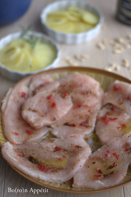 Kiedy mam więcej czasu na gotowanie lubię zebrać kilka składników, zamknąć się w kuchni i pokombinować. I tak było z tym daniem. Odmroziłam wcześniej zamrożone sznycle z indyka, które nie mogą zbyt długo leżeć, bo wyschną. Przyprawiłam je dość konkretnie przy użyciu oliwy z oliwek, pieprzu, soli i pepperoni. Pierwotnie miały być podane z ryżem, ale naszła mnie ochota na zapiekankę ziemniaczaną w zupełnie innym stylu niż dotychczas. I to był trafny wybór! Wyczarowałam idealną kombinację smaków. Pewniak obiadowy dla niewybrednych, którym takie smaki odpowiadają. Z nutą włoską mimo, że zapiekanka ziemniaczana i schnitzel kojarzą się z kuchnią niemiecką czy austriacką.